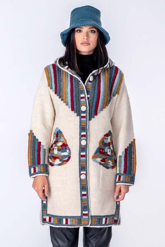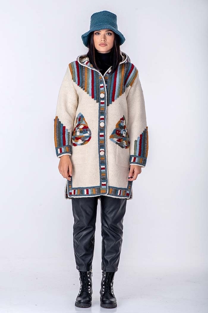 Kombinacija geometrijskog veza i motiva sela sa kućicama.