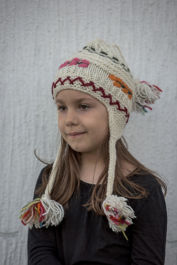 bela ručno pletena vunena dečija kapa sa kićankama i šarom - ručno pleteni proizvodi od vune - wool art